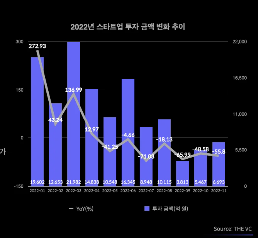 스타트업에 대한 투자건수와 금액의 감소도 영향을 미쳤다고 할 수 있습니다.