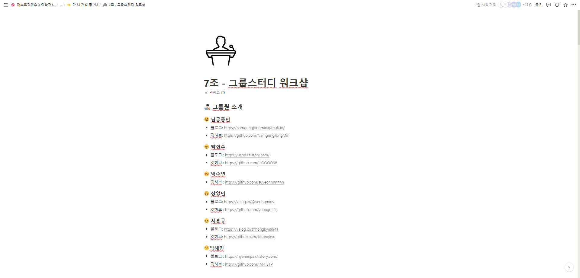 제가 속한 7조 그룹은 특이하게도 6명으로 이루어져 있습니다.