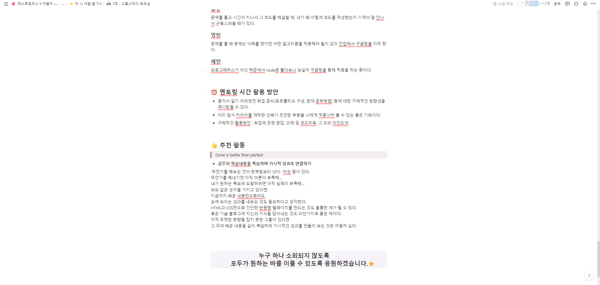 개인 적으로 공유하고 싶은 내용에 대해 얘기를 나누는 시간 이었습니다.