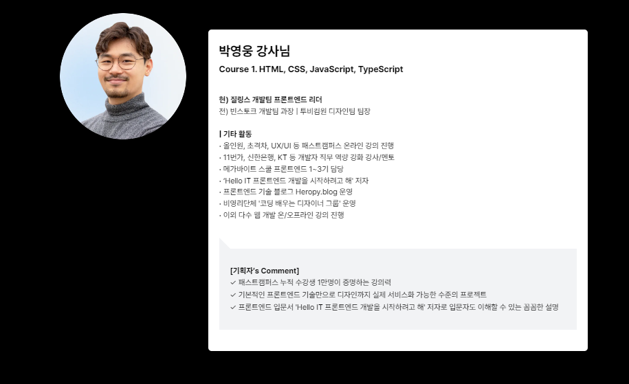 FE로서 알아야 할 라이브러리 및 프레임워크를 담당하고 계시기 때문에 가장 많이 접하게 될 강사님입니다.