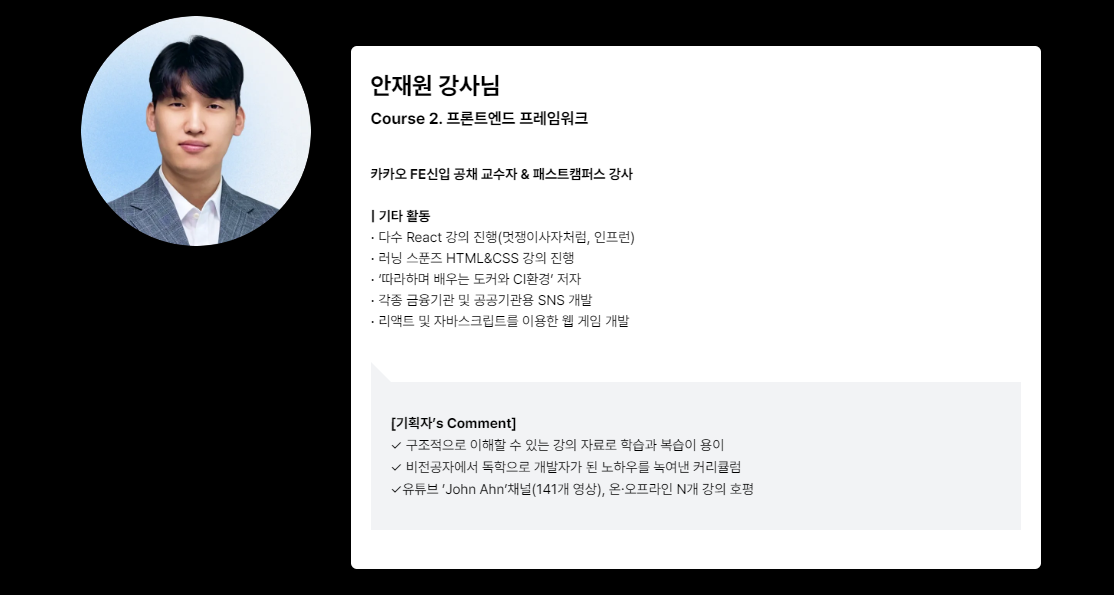 안재원 강사님은 위의 프로필에서처럼 프론트엔드에서 정말 중요하다고 할 수 있는 리액트, 넥스트 등